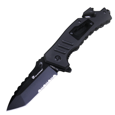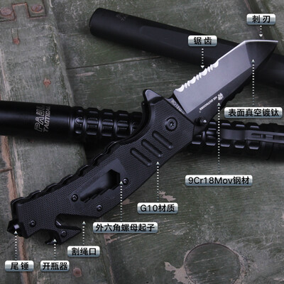 刀面采用真空镀钛材质,附着力以及抗腐蚀性较强,锯齿设计可以快速切断绳子。刀柄处多功能设计,含尾锤开瓶等,使用方式多样化。
