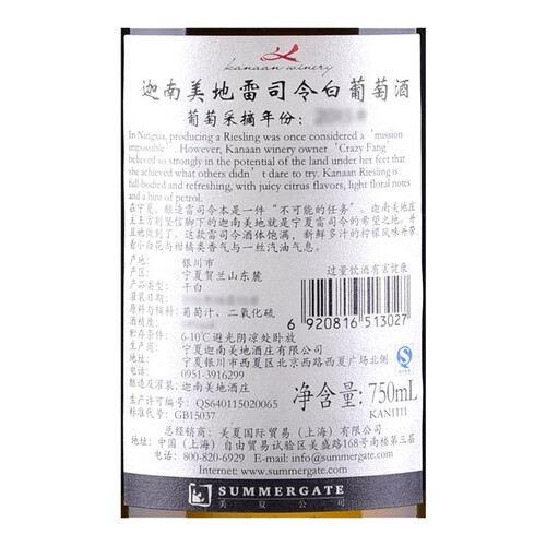 迦南美地 宁夏贺兰山白葡萄酒