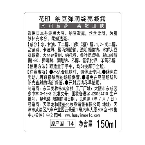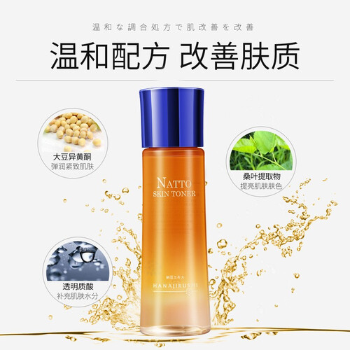 添加丰富的日本纳豆精粹,打造保湿谭亮的肌肤效果。透明质酸钠与桑叶的提取物成分,助力提亮肌肤的暗沉。