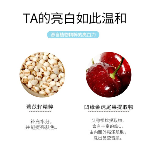 蕴涵丰富水果维生素及樱桃、薏苡植物精华,水润修护和深层焕白,让肌肤如水果般晶莹剔透。泡沫细柔丰富,深层清洁面部多余油脂。