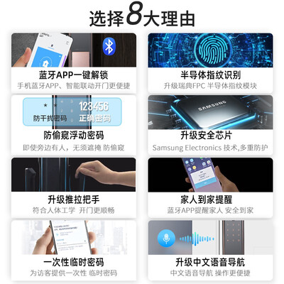 蓝牙APP联动解锁,实时查案门开关状态,到家自动提醒,令您更安心。设有二位浮动密码,能防止他人偷窥开启,破解起来更困难。