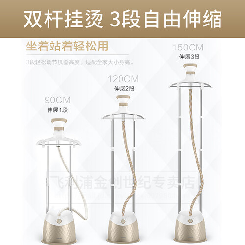 挂烫机采用双杆设计,放置时牢固可靠,避免熨烫时摇晃。且支杆可自由伸缩,站着坐着均可轻松熨烫。