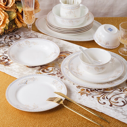 餐具采用高档的骨瓷制作,造型偏复古风,比较传统,釉面光滑细腻,汤勺、味碟、盘子等套装完整,风格很是优雅清新。