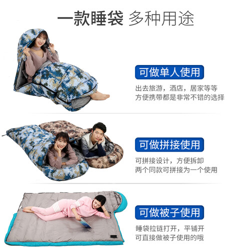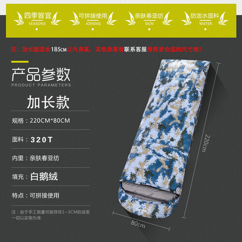 迷彩单人隔脏睡袋,打造军旅风格,易于收纳外出使用方便。填充厚实羽绒舒适包裹高效锁温,质地轻盈睡眠舒适无感。