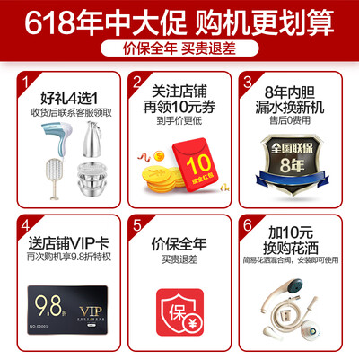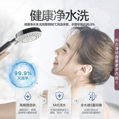 内胆采用全新的净水洗工艺,实现高温消毒去污,保持水质洁净健康。大功率速热的加热管,快速升温不久等,全家畅洗更舒心。