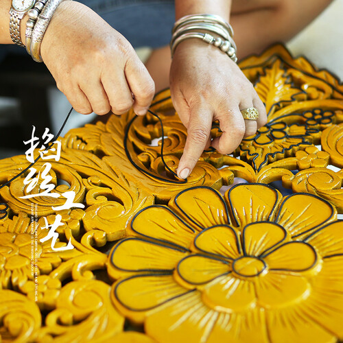 木雕匠人经过数天打磨,将实木雕琢成莲花,当莲花遇上金箔,彩色玻璃,压上丝线,朴素也将变得流光溢彩。