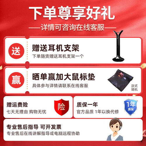 配置有强化虚拟7.1环绕音效系统,能轻松实现听声辩位,游戏更尽兴;搭载有给力电子内芯,耳机适应能力更为广泛,声场更宽广。