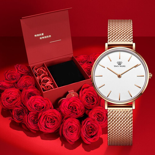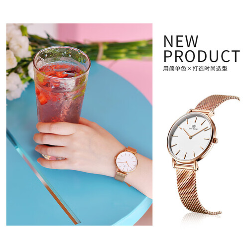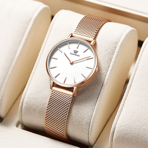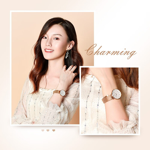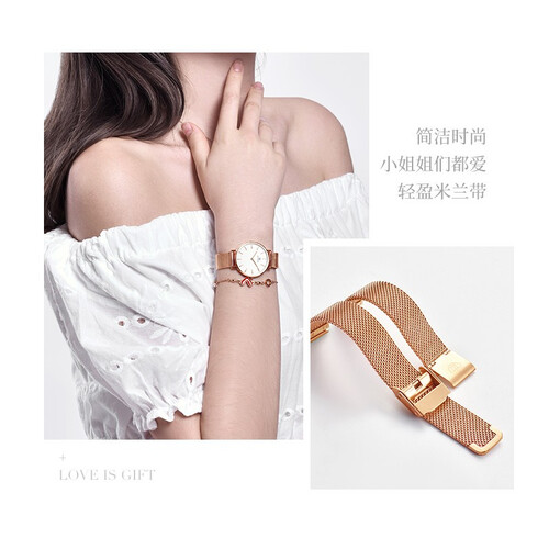 表盘尺寸小巧纤薄,搭配精致米兰针织表带,佩戴舒适又好看。表圈和表带是玫瑰金色,具备女神气质,更能衬托皮肤白皙。