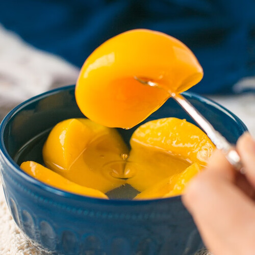 新鲜的黄桃制作的罐头,生产过程不添加防腐剂,家人吃着更放心。能够长时间进行锁鲜,使得营养不流失,吃起来更美味。
