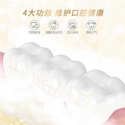 专业的配方,添加了碳酸钙、丙二醇、纤维素胶等,成分安全。早晚用它清洁口腔,可以防止根部蛀牙,保护口腔健康。