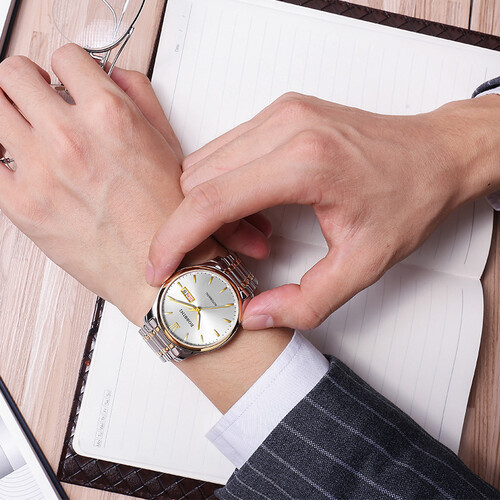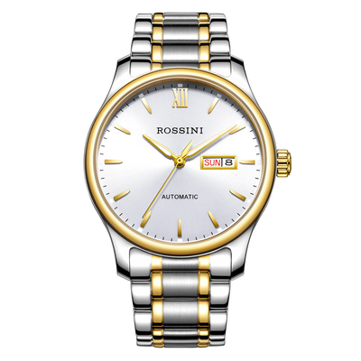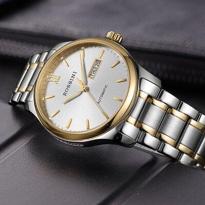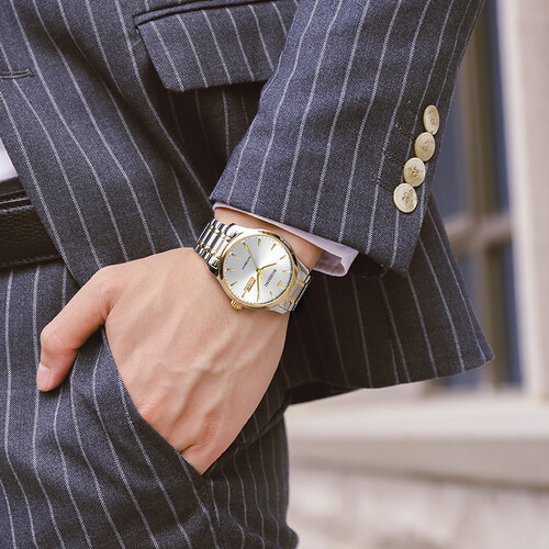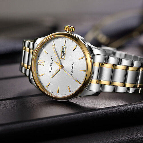 细腻太阳纹大开面表盘,大气简约,更显成熟稳重。金色表壳与时符,更具华丽典雅。精钢表带,金银光泽相间,更具艺术性。