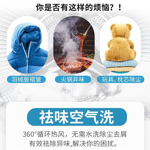 祛味空气洗,通过循环热风穿透纤维,带走异味和灰尘,祛味不伤面料。配备大容量内桶,一次可清洗更多衣物,无需频繁洗涤更省水。