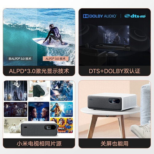 采用激光光源,流明度高,色彩表现力突出,实现鲜明清晰的影像。而150英寸巨幅画面,给你身临其境的观影体验。