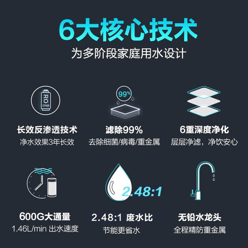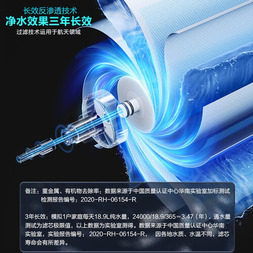 具有自动冲洗功能,保持滤芯持久洁净,延长滤芯的使用寿命。搭载航天净水技术,强力滤除水垢、有机物,让饮水更加安心。