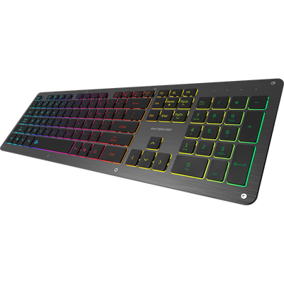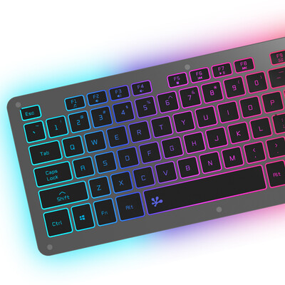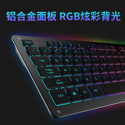 采用独特剪刀脚设计,手感舒适,办公室办公时不打扰他人休息。使用铝合金金属面板和RGB七色背光,八种灯效,更酷炫。