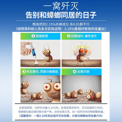 白色乳状的质地,无色更安全,有着较强的黏着性,符合蟑螂的口味,可以很好的达到杀虫效果。受用方便省心,解锁除蟑新体验。