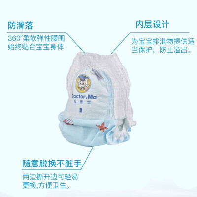 精选优质棉毛浆芯体,柔软舒适,呵护宝宝娇嫩肌肤。采用独立腰围设计,360度贴合宝宝身体。内层防漏设计,防止渗漏。