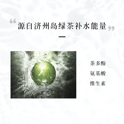 济州岛绿茶新鲜生榨取,富含茶多酚及氨基酸,净透补水回复通透。添加玻尿酸与麦芽寡糖葡糖苷,深层补水老化角质,保持肌肤柔软。