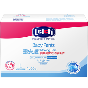 这款拉拉裤采用专利双向导流层无纺布,表面光滑,不仅可以快速导流,还可以减少与宝宝肌肤的摩擦。