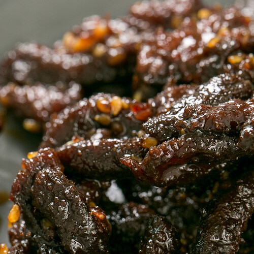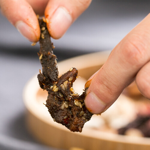 精选黄牛后腿肉,精壮的瘦肉饱满细腻,肉质柔嫩,软硬适中。口感紧致弹滑,酥香耐嚼有劲道。