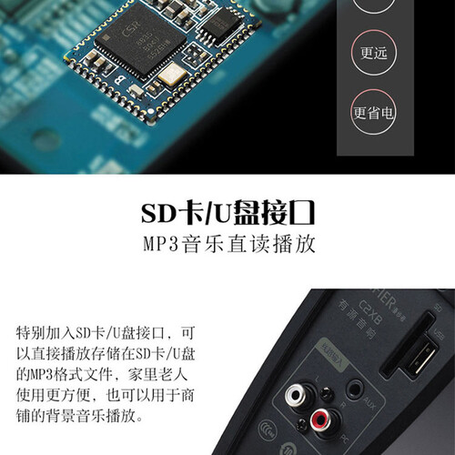 全新升级,内置CSR高品质蓝牙4.0模块,更快更远、更省电,畅享无线好音乐。6.5英寸大口径低音炮,震撼低频动人心魄。