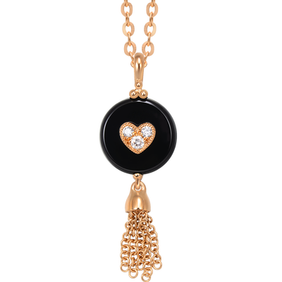 主体采用黑玉髓和18k红色黄金材质制作而成,中间采用钻石镶嵌浪漫四叶草,寓意打开生命之花。镶嵌的小圆珠边,丰富造型。