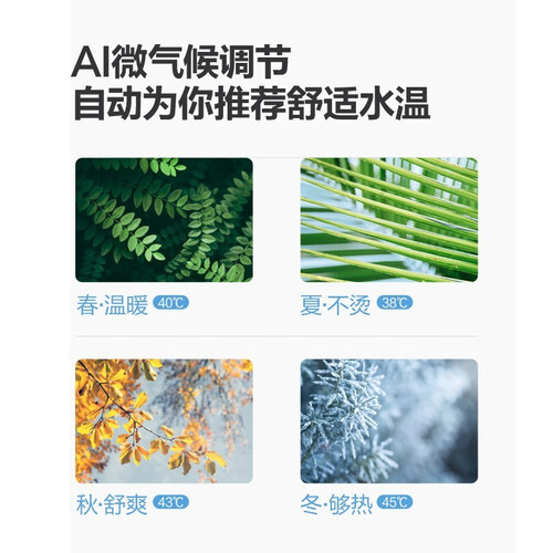 具有四季自动调温模式,自动调控舒适水温,无需手调。无级变升模式,根据用水需求自动调整水位,家用更加省水。