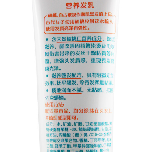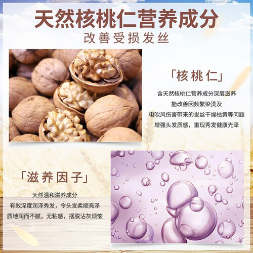 含有核桃仁成分,能够增强发丝质感,重现秀发健康光泽。搭配滋养因子,有效深度滋养秀发,令秀发柔顺亮泽。