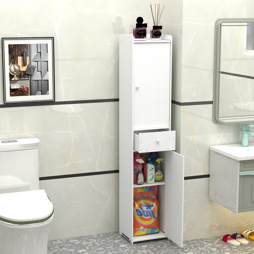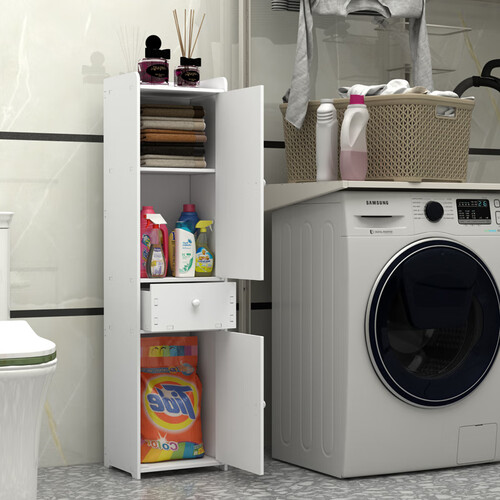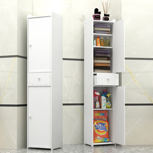 纤薄柜体设计,可放入马桶旁边,充分利用夹缝空间。大容量空间设计,可摆放大瓶洗衣液,收纳效果好。