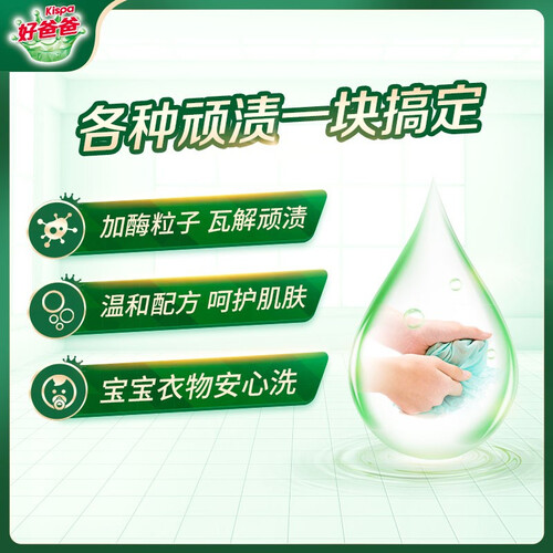 富含加酶粒子,快速去除顽固污渍,立竿见影,恢复衣物洁净光彩。搭配天然洗涤成分,质地轻柔,适用幼儿衣物,安全可靠。