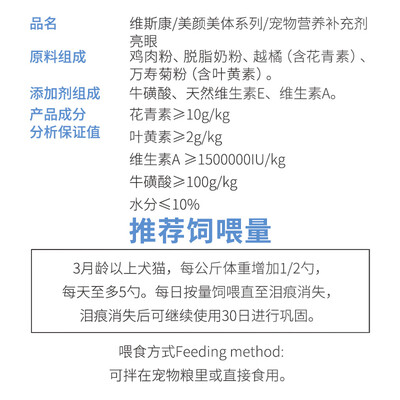 维生素A与牛磺酸精心配比,令爱宠双眸持久都明亮。万寿菊、越橘等天然原料,多重天护眼因子加持,更适合猫猫敏感双眸。