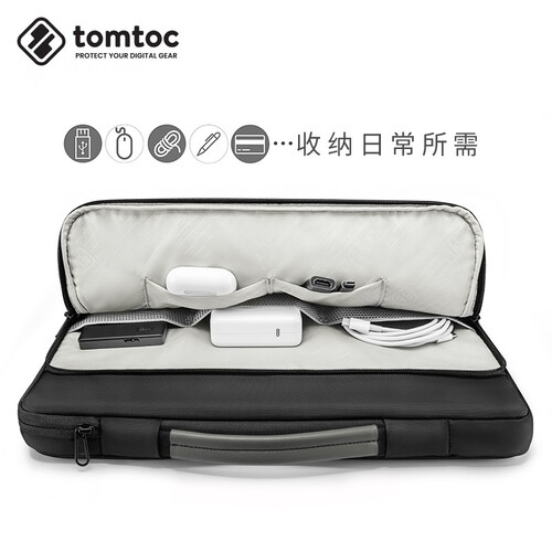 凹槽护条设计可以将笔记本电脑嵌入,有效阻挡外力磕碰,温柔呵护包内设备。可以将电脑配件独立收纳在侧包,节省查找物品的时间。