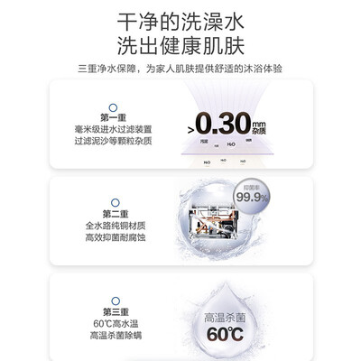 设计清晰的智能化数字显示屏,直观显示当前的温度变化。内置三重过滤装置,可有效净化水质,从而呵护家人的肌肤健康。