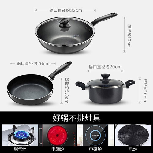这款锅具套装采用了通用锅底的设计,不管是电磁炉还是燃气灶都可轻松使用。不粘涂层工艺,炒菜不粘锅无油烟。