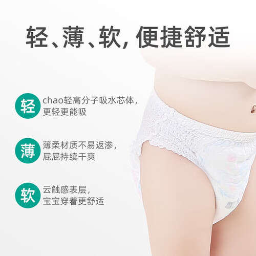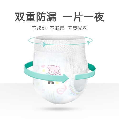 使用的弹力环腰设计,高弹的拉伸力,让宝宝轻松活力,不会有勒压的感觉。而且使用的高分子吸收芯体,吸收量大,不易反渗。