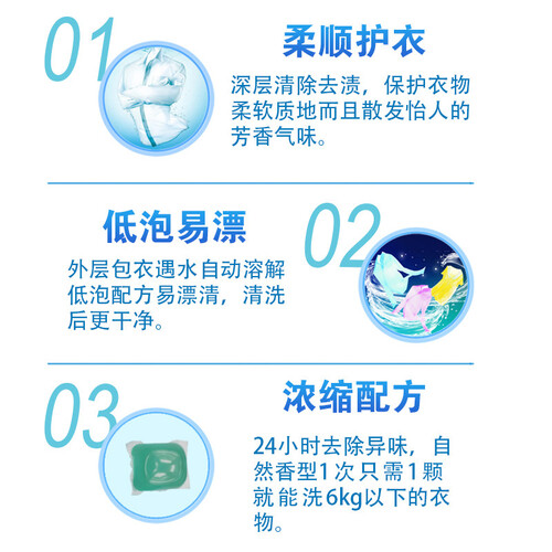 外层包衣遇水自动溶解,低泡配方易漂清,清洗后更干净。24小时去除异味,自然香型1次只需1颗就能洗6kg以下的衣物。