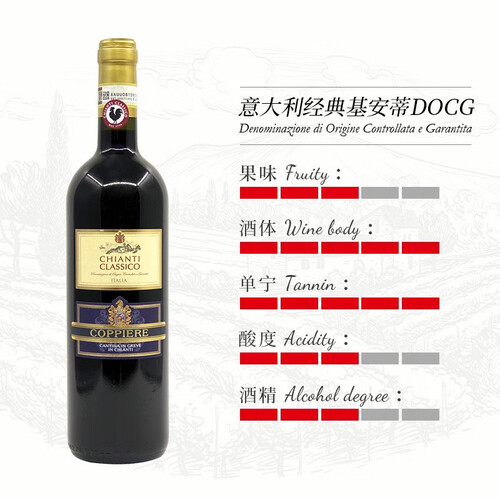 采摘具有盛名的桑娇维塞的高品质葡萄,在橡木桶中混酿陈年,酒体更加醇厚饱满,散发出特有的紫罗兰花香。