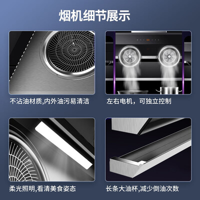 双电机,比仅有一个电机的油烟机拥有更大的吸力,使用寿命更长,方便贴心。贴心的侧吸设计,适合多种不同身高的人群使用。