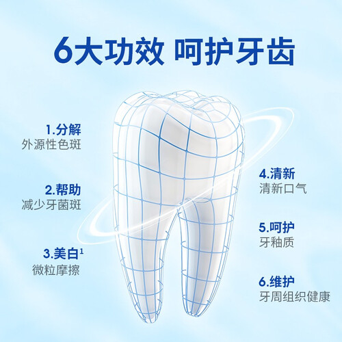 蕴含一定浓度的小苏打成分,能够让牙齿保持洁净感,看上去充满光泽。加入微粒成分,通过刷牙摩擦,让牙齿更美观。