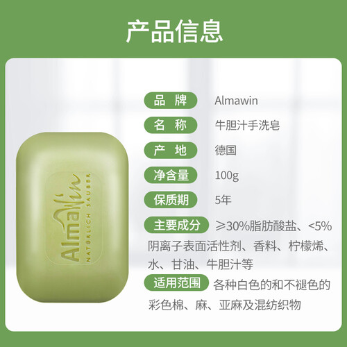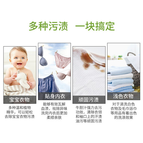 这款洗衣皂融入了牛胆汁成分,牛胆汁酸中所含盐分的乳化功效能起到去渍作用,有助于深度清洁衣物上的顽固污渍。