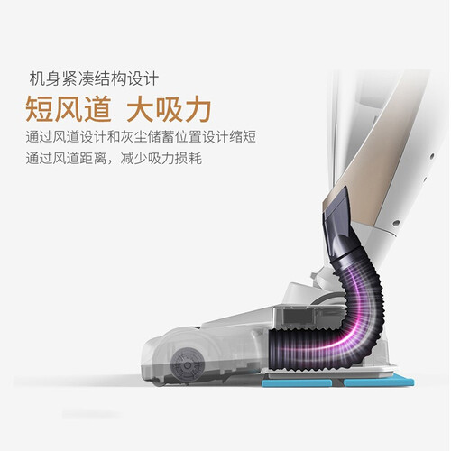 机身紧凑结构设计,短风道大吸力,通过风道设计和灰尘储蓄位置设计,缩短通过风道距离,减少吸力损耗。