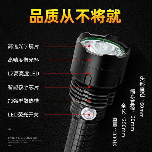 机身内置高电流灯芯,配合大口径铝合金光杯,远射效果佳。搭载26650毫安容量电池,保障续航能力,并设计了多种亮度。
