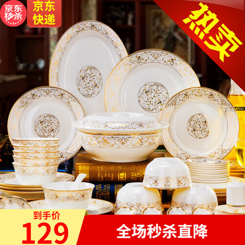 传世瓷 骨瓷雕金碗碟套装