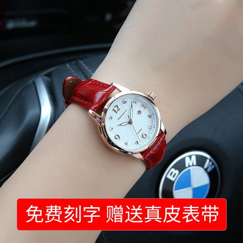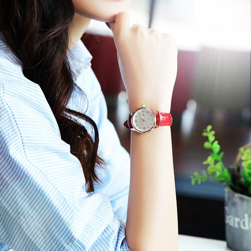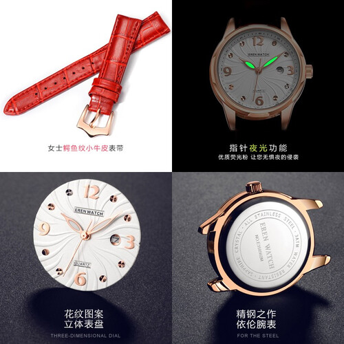 选用花瓣图案表盘,镶嵌八颗水钻,为手表增添一丝创意感,时尚又精致;指针夜光功能,让你夜间也能清晰看时间。