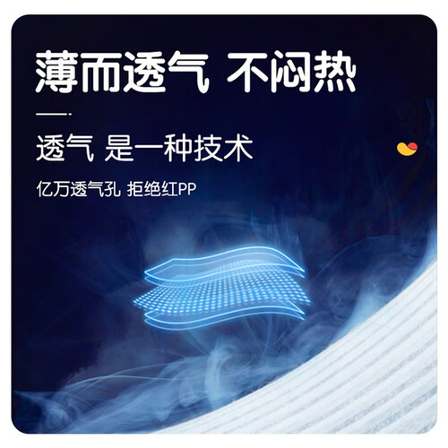 超薄的瞬吸芯体技术,带来双倍吸收的尿液效果。锁水能力强,避免漏尿尴尬,长时间干爽透气,更有效预防宝宝红屁屁。