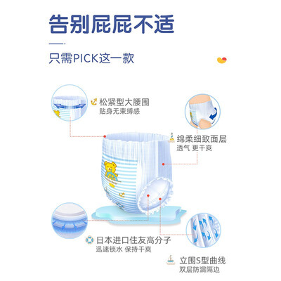 设置数万个微型透气孔,有效提升了透气性能,为宝宝提供舒适穿着空间。腰部采用进口橡筋,穿着不勒小肚肚。