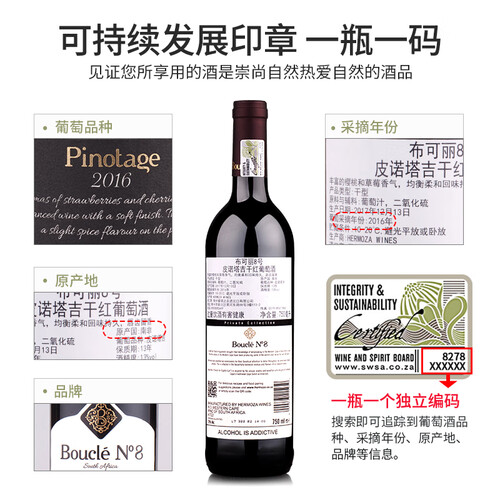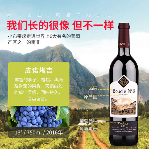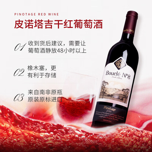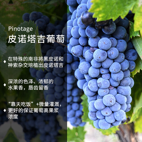 手工采摘的皮诺塔吉,经过二次分拣保证每一颗葡萄完好,使用橡木桶酿制熟化,口感浑厚浓烈,具有丰富的樱桃和草莓香气。