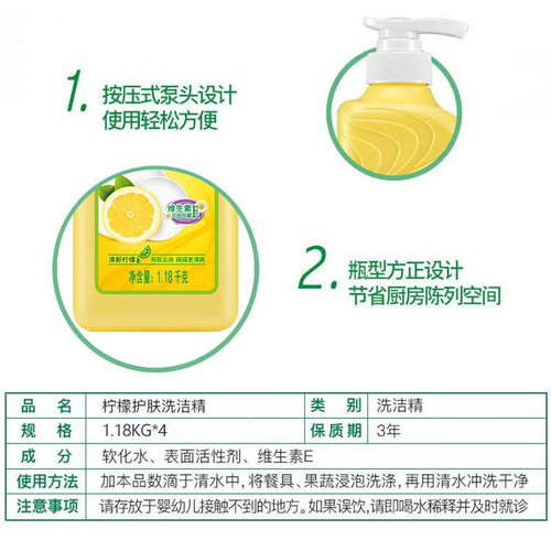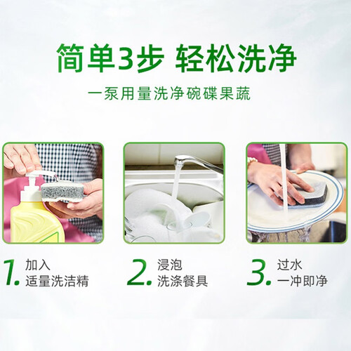 采用科学配方制作,去污效果好,可轻松冲洗干净,节约用水。按压式泵头设计,取用方便,不易浪费和弄脏剩余洗洁精。