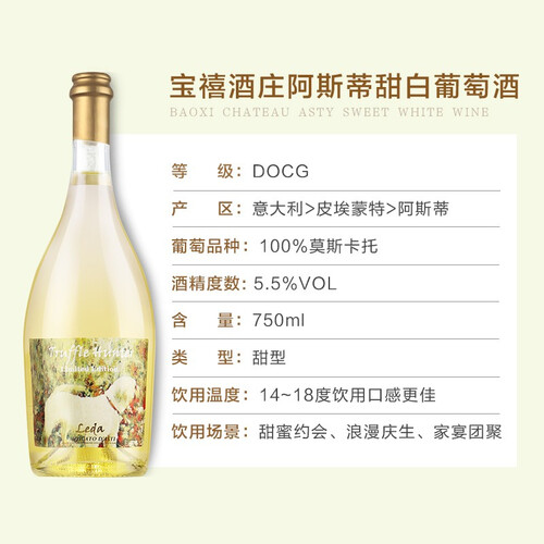 宝禧酒庄阿斯蒂甜白葡萄酒,源自意大利进口。入口有浓郁的花香、果香,甜美清爽,适合女士饮用。