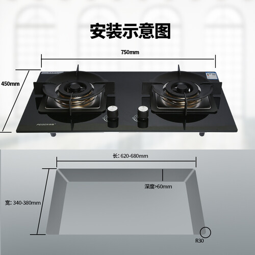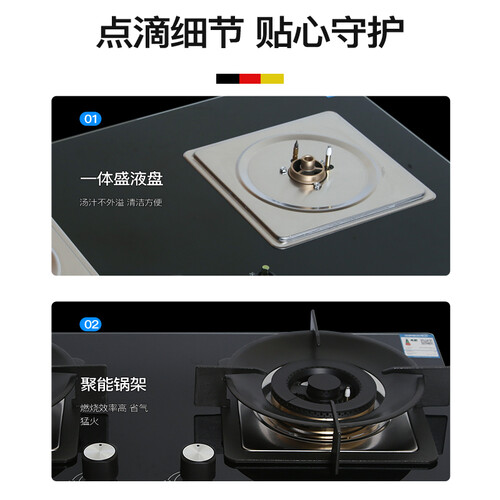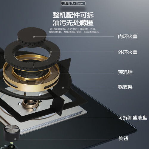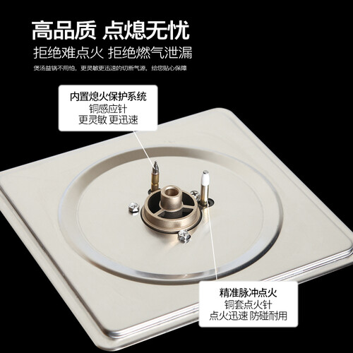 采用全铜火盖及炉头,具有良好的耐腐蚀性,无惧油污沾染,经久耐用。黑色外观,打理更省心。台嵌两用设计,安装灵活自如。